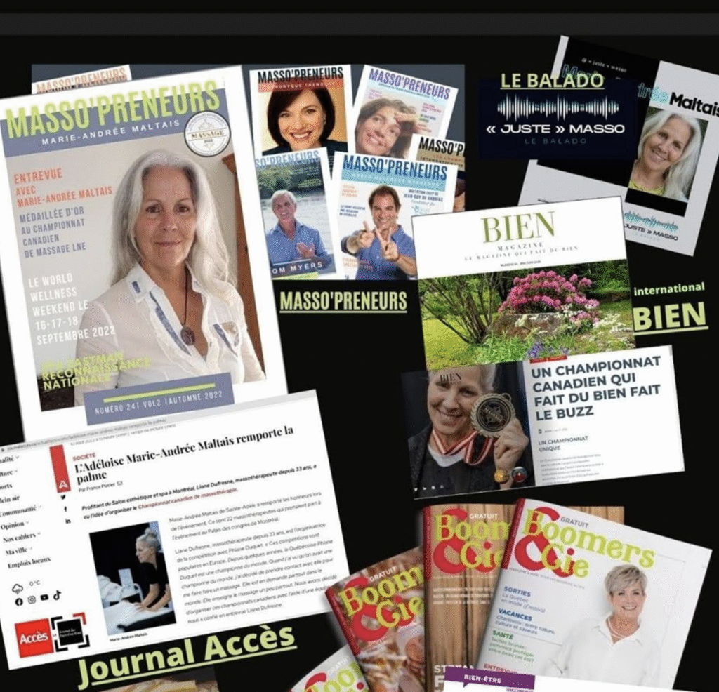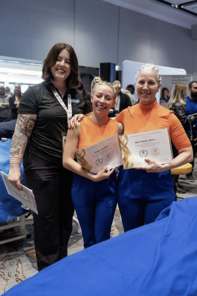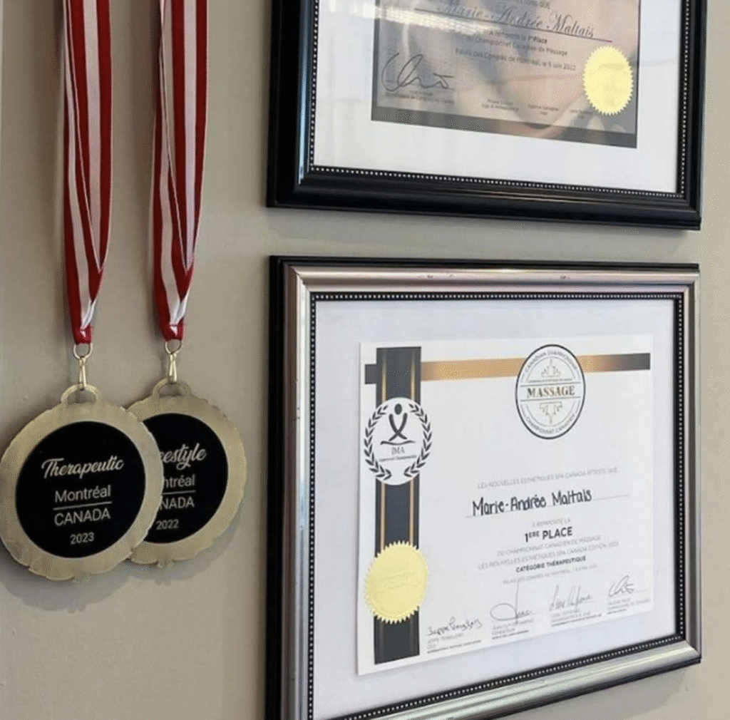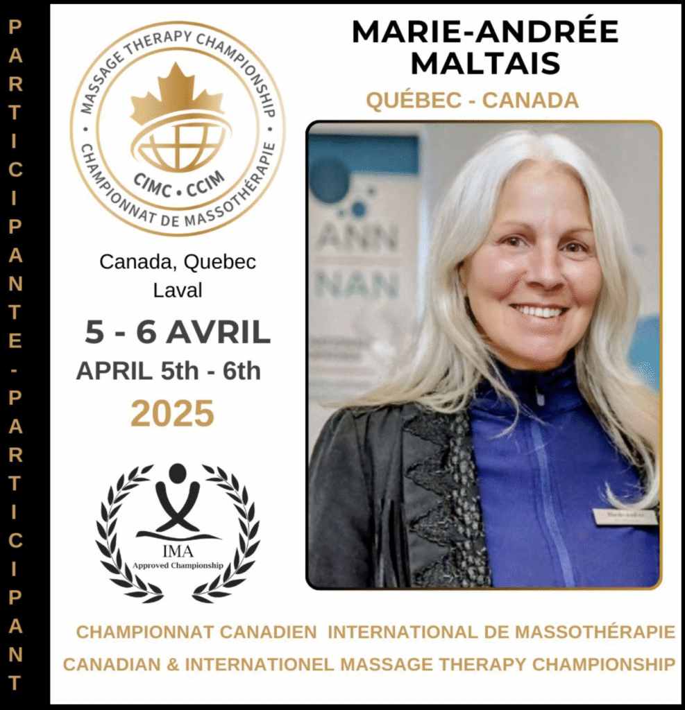 In the dynamic world of massage therapy, shared experiences and professional recognition shape our growth. This page celebrates key milestones in the journey of Marie-Andrée Maltais — an exceptional massage therapist, three-time gold medalist, and dedicated trainer.