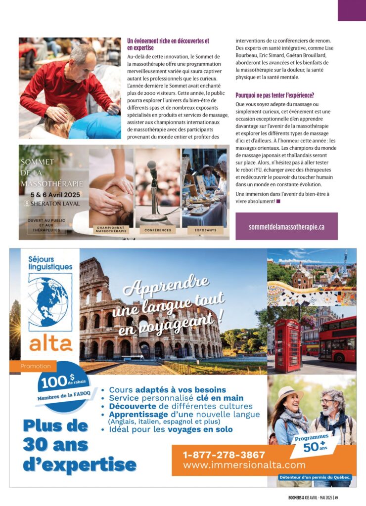 Marie-Andrée has built a strong reputation based on the quality of her touch, her inspiring teaching approach, and her ability to transform lives. Her work has been featured in several specialized media outlets such as Les Nouvelles Esthétiques Canada, Massopreneurs Magazine, MassoCie, as well as at events like the ANN and ANM conferences.